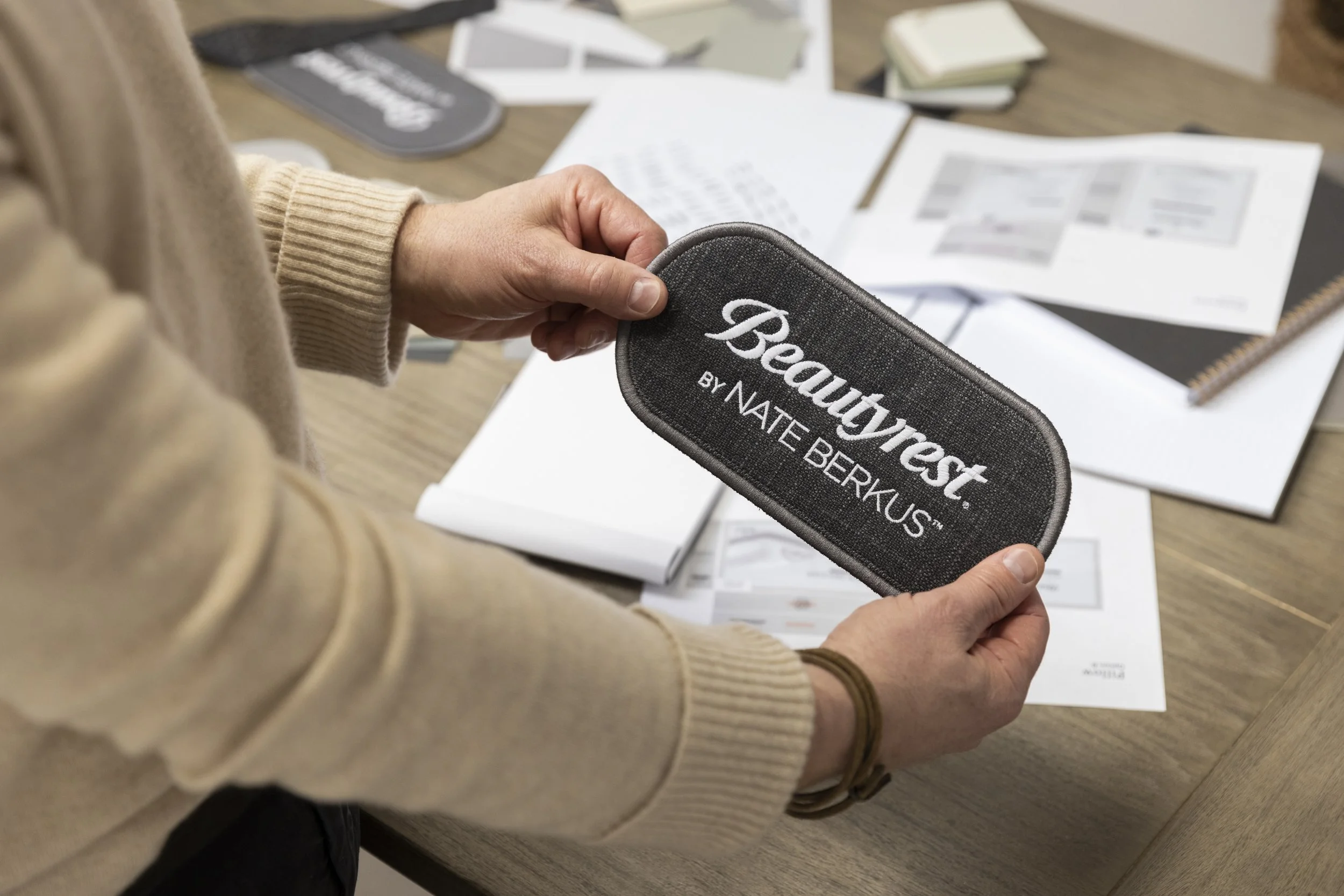 A person holding a fabric patch that reads 'Beautyrest by Nate Berkus' with a desk covered in papers and brochures in the background.