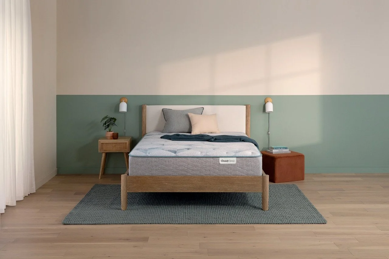 Part of a bed with a mattress labeled 'BeautySleep' on a wooden bed frame, on a wooden floor.